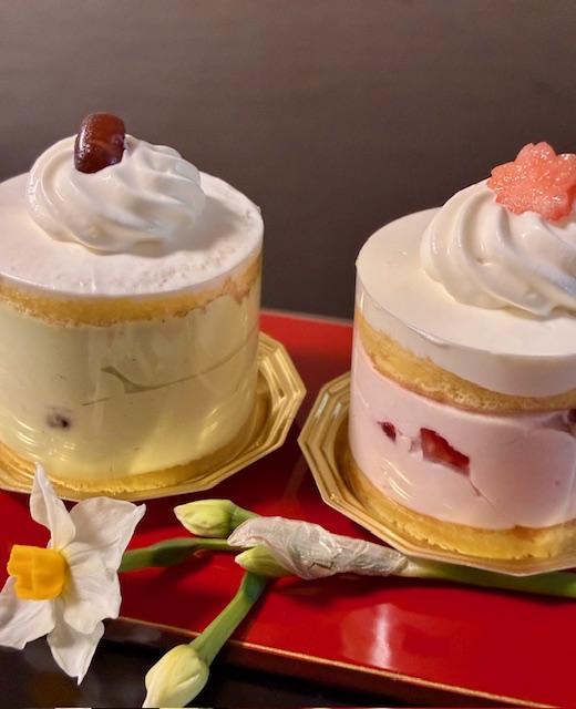 春らしい行事といえば「ひな祭り」和やかで麗しいこの行事をお菓子で表現したいと思いました。内裏雛に見立てた透明セルクル作りのショートケーキです。お内裏様は抹茶味、おひめさまはいちご味。直径8cmのトレーに乗せます。高さは7cm。6個から7個入る容器と保冷剤をお持ちください。講習料は7,700円。