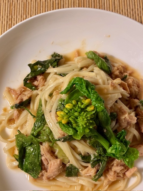 ランチは完成。甘辛ツナのあったかうどんです。お味噌を使った甘じょっぱいタレ、ツナ、レタスをレンジであたため茹で上げのおうどんを絡めます。はるらしく菜の花を飾ってm胡椒を軽くふって召し上がれ。冷凍うどんを使えば火も包丁を使わない簡単調理。