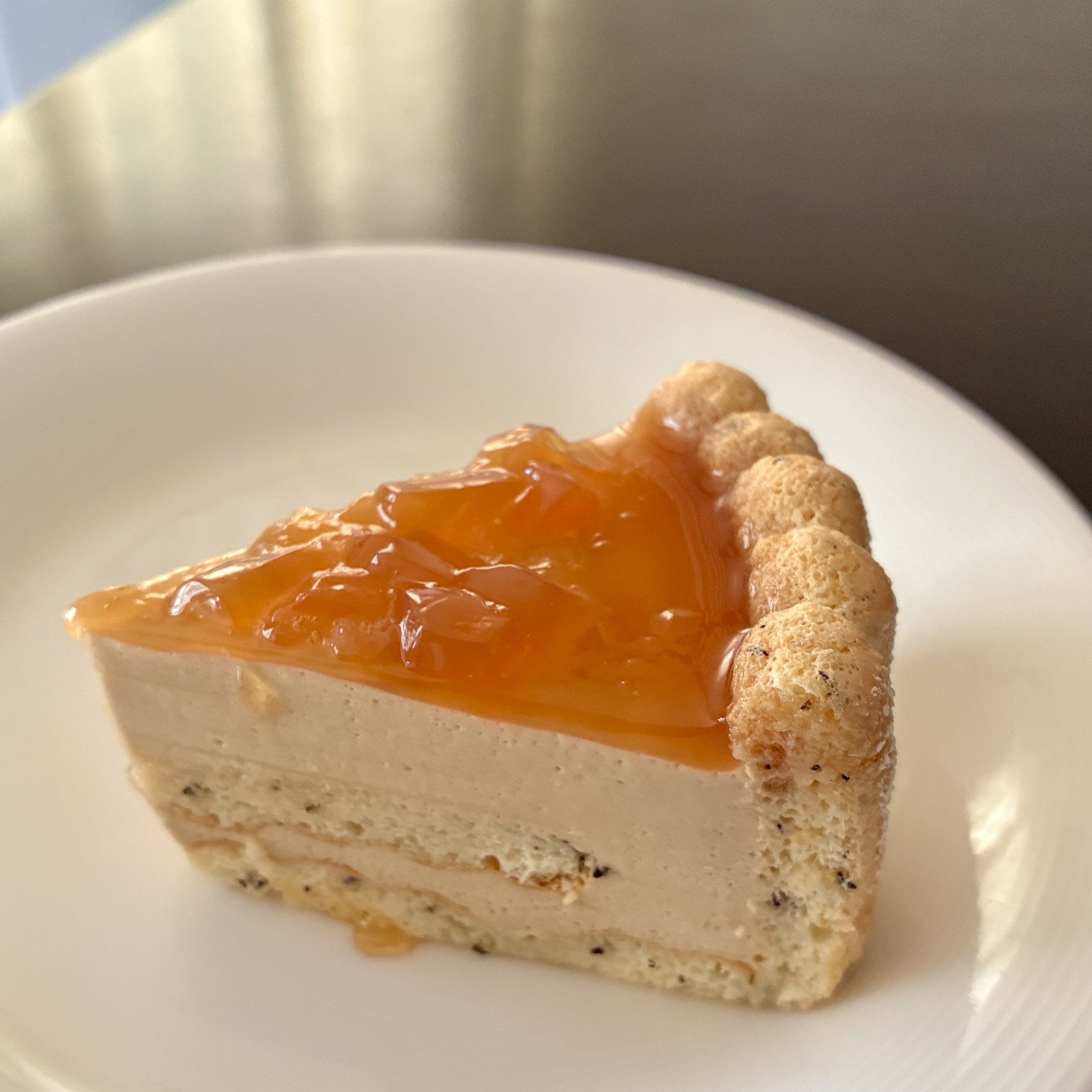 爽やかなアールグレイを使ったムースです。アールグレイの茶葉を入れたビスキュイでケースを作って、口溶けの良いムース青流して固めます。上面はゼリー。ビスキュイもムースも基本的なものなので、色々応用していただけると思います。