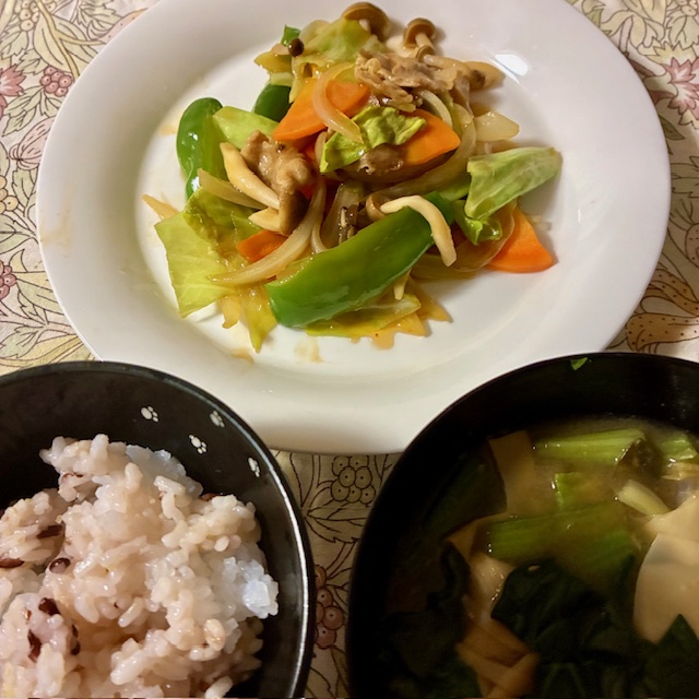 ランチは中華風の甘酢餡炒め。ご飯と汁物を添えます。有り合わせの材料でも作れるのが、中華料理の良いところです。片栗粉まで入れた調味料で仕上げるので簡単。